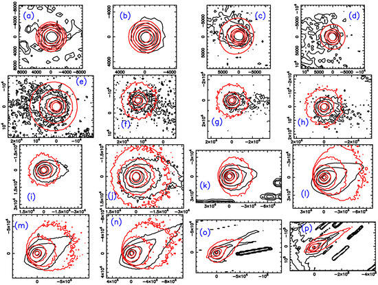 Isophote fields of a subset of observed (black contours) and modeled images (red contours) at different heliocentric distances (in au), as follows: (a) −4.33; (b) −3.80; (c) −3.54; (d) −3.20; (e) −2.95; (f) −1.51; (g) −1.42; (h) −1.37; (i) −1.27; (j) −1.25; (k) +1.25; (l) +1.30; (m) +1.47; (n) +1.62; (o) +2.69; (p) +3.14. Negative distances indicate pre-perihelion, positive post-perihelion branch. The x- and y-axes are all labelled in km projected at the comet distance. All images are shown in the conventional north-up and east-to-the-left orientation. Adapted from [57].