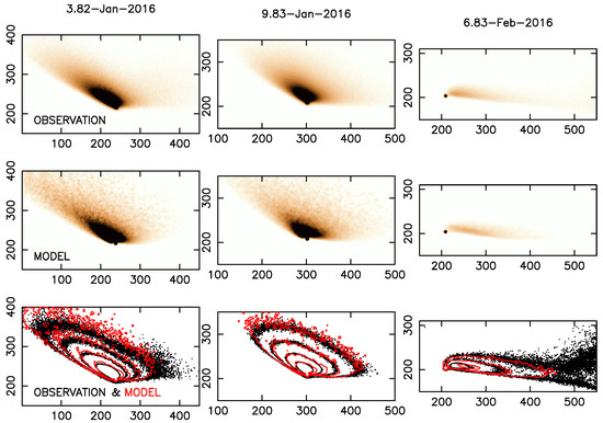 Upper panels: observations of comet 249P/LINEAR with the instrument OSIRIS (Optical System for Imaging and Low-Intermediate-Resolution Integrated Spectroscopy) at the 10.4 m Gran Telescopio Canarias (GTC) at the indicated epochs. Middle panels: best-fit synthetic images obtained through minimization in the four-dimensional dust parameter space with the Monte Carlo dust tail code. Lower panels: isophote fields (black contours, observation; red contours, model). All the images are oriented in the north-up east-to-the-left conventional orientation. The x- and y-axis are given in pixels. The physical dimensions of the images are, in km × km, and from left to right, 87,120 × 48,400, 81,000 × 40,500, and 112,080 × 44,832. Adapted from [75].