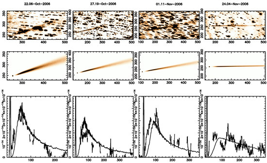 Upper panels: observations of comet 249P/LINEAR with the 0.4 m telescope of Great Shefford Observatory near 2006 perihelion at four epochs. Middle panels: best-fit synthetic images obtained with the same dust physical parameters obtained as for the 2016 images in Figure 6 except for a somewhat smaller production rate. The nucleus is seen detached from the tail in the observations and the simulations. The physical dimensions of the images are in km × km and from left to right, 176,734 × 83,683, 266,040 × 126,224, 131,879 × 133,907, and 350,470 × 164,982. Lower panels: scans along the tail for the observed (crosses joined by straight lines) and model (solid lines). The observed scans drawn are limited to the less contaminated regions by background trailed stars. The x- and y-axis of the scans are expressed in pixel and solar disk intensity units, respectively. Adapted from [75].