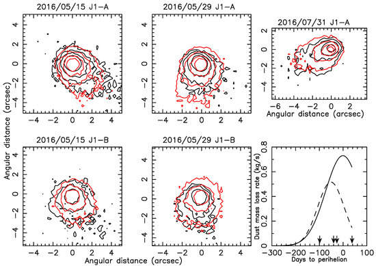 Measured isophotes (black contours) and best-fit model isophotes (red contours) for different dates for the two components J1-A and J1-B of asteroid P/2016 J1. The lowermost right panel displays the best-fit dust loss rate as a function of time to the perihelion for components J1-A (solid line) and J1-B (dashed line). Arrows indicate the different observation dates of the images. Adapted from [79].