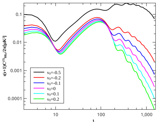 In order to obtain the tensor angular power spectra for the modified gravitational waves propagation, we modify CAMB [30] by taking into account Equation (9). Our numerical results are presented in Figure 1. We show that the modified gravitational-wave propagation has impacts on the BB tensor angular power spectrum. The negative enhances the BB tensor angular power spectrum, while the positive reduces the BB tensor angular power spectrum.
