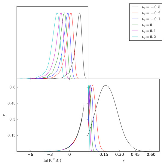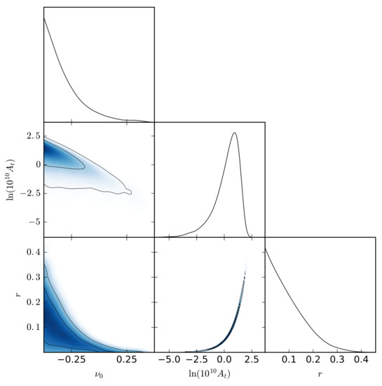 In the standard CDM model, the six parameters are the baryon density parameter , the cold dark matter density , the angular size of the horizon at the last scattering surface , the optical depth , the scalar amplitude and the scalar spectral index . We extend this model by adding the tensor-to-scalar ratio r and the friction factor , and consider these eight parameters as fully free parameters, i.e., , . We use the publicly available codes Cosmomc [31] to constrain parameters, which adds the modified gravitational waves propagation in Equation (9) and the modified inflation consistency relation in Equation (14). The numerical results are presented in Figure 2.