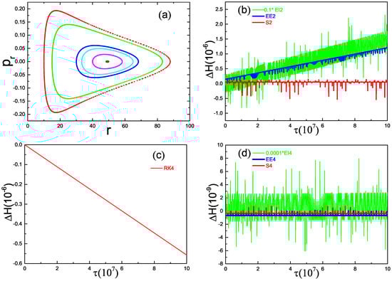 Numerical test performance. (a) Poincaré sections on the plane . The parameters are . Initial conditions of orbit 1 colored red are , , , and is determined by Equations (11) and (12). The other orbits are and . (b–d) Hamiltonian errors of orbit 1 for different algorithms. The proper time step is .