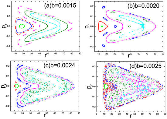 Dependence of the orbital dynamics on electromagnetic parameter b. Poincaré sections with the same parameters , and different positive values of electromagnetic parameter b are given. The orbits are same as in Figure 1.
