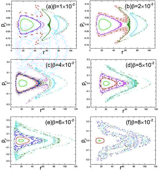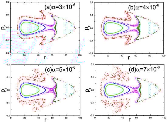 The parameters are the same as those in Figure 1, with the exception that the electromagnetic parameter increases slightly. When , the orbits corresponding to initial separations r = 10, 15, 30, 40, 50 and in Figure 2a are regular KAM loops. These smooth curves in the Poincaré section indicates that the motions of the orbits are quasi-periodic. If the electromagnetic parameter becomes a little large, then . As shown in panel (b), there are two KAM loops with an initial orbit condition (colored blue and olive) replaced by several separate islands. There are many random discrete points (colored cyan) in the phase diagram when the orbit takes an initial value of . This indicates that the regularity of the orbit is broken. That is to say that the motion of the test particle becomes weakly chaotic. With a further increase in the electromagnetic parameter, e.g., , many orbits ( ) turn out to be chaotic in panel (c). In fact, the extent of chaos is also strengthened. Given electromagnetic parameter , the chaotic motions of test particles are filled in a large region, as shown in panel (d).