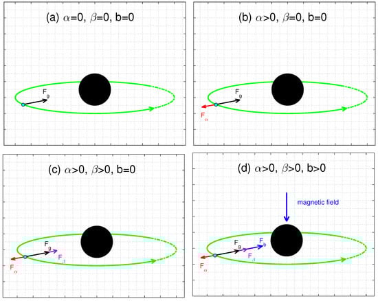 Representation of the force responding to the parameters. Case (a) refers to a test particle moving around Schwarzschild black hole, and the particle only suffers gravity from the central object. Case (b) refers to the Schwarzschild black hole with a cosmological background, and repulsive force is the resultant action from the gravity of galaxies and galaxy groups or clusters. Case (c) considers the appearance of dark matter, and force is an effect of the gravitational force of dark matter. Case (d) describes the spacetime immersed in an axially magnetic field, and Lorentz force acts on charged particle additionally.
