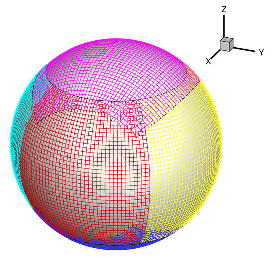 Our simulated region is from 1 R to 20 R. The six-component grids system (Figure 1) consisting of six identical component meshes with partial overlap on their borders is used in this paper [27,28,31]. The following grid partitions are employed: . R if R; with if R; if R.