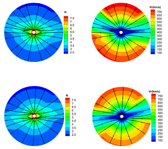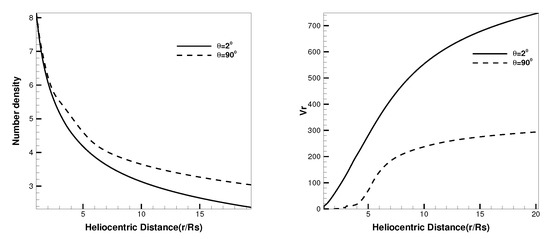 Figure 9 presents the variation of number density N and radial speed from 1 R to 20 R at different latitudes, where corresponds to the open field region while corresponds to the HCS region. As usual, the fast solar wind exists in the open field region, whereas the slow solar wind exists in the HCS region, and the variation of number density is opposite to that of the speed.