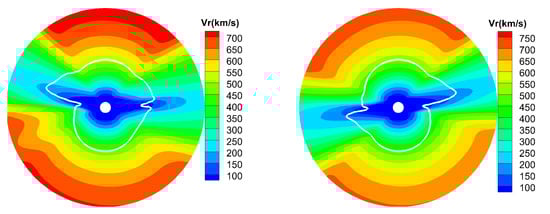 Figure 4 presents the radial speed and Alfvénic surface (white line) on the meridional plane of and from 1–20 R. Following [30], the Alfvénic surface is defined as . Since the solar wind is not spherical and smaller velocities exist at lower latitudes, the Alfvénic surface is wispy. In the inner corona below the Alfvénic surface, the magnetic stress dominates the interaction. The coronal magnetic field is largely dipole-like around the minimum phase of solar activity. The gradient of radial field strength in latitude, with stronger field at higher magnetic latitude, bends stream lines from the radial direction toward the magnetic equator. However, in the corona beyond the Alfvénic surface, it is the inertia of radially accelerated plasma flow that dominates the magnetic field-plasma interaction. The lowest Alfvénic surface occurs in the equator and the highest Alfvénic surface occurs in the pole [30,34,35]. Based on the radial evolution of the direction of coronal magnetic field, ref. [35] showed that the coronal helmet streamer belts observed at several heights by SOHO/LASCO, together with the source surface field of the horizontal current-current sheet-source surface model, can be used to find the heliocentric distance of the lowest and highest Alfvénic critical point. The highest Alfvénic critical point around the solar minimum is located between 10 and 14 solar radii. Similar to that in [30,35], the Alfvénic surface ranges from about 5 to 11 solar radii during this Carrington rotation.