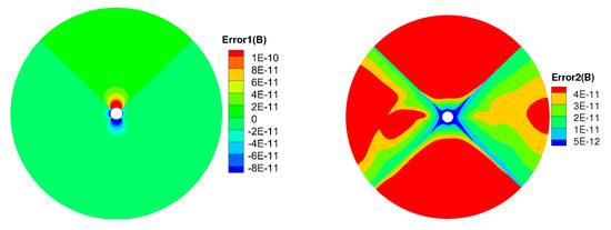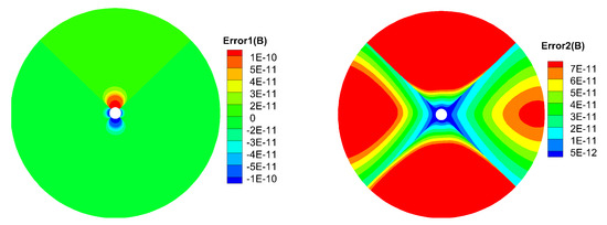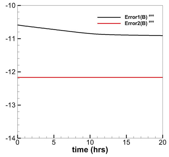 Figure 8 shows the evolution of the average divergence errors as a function of time. The average relative divergence errors are defined as , , where M is the total number of cells in the computational domain. We can see that and are about and , respectively. These divergence errors stay the same after 10 h and no obvious large error appears after a long run time. Thus, the magnetic field can be stated as divergence free during calculation.