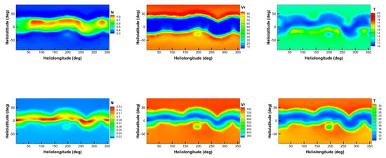 Figure 10 displays the number density, radial speed and temperature maps for the MHD steady-state solution at 2.5 R and 20 R. The left column denotes number density N with unit from top to bottom, the middle column denotes radial speed with unit km/s, the last column denotes temperature T with unit K. Obviously, the number density decreases with radial distance while radial speed increases. The HCS region has high density, low speed and low temperature, whereas the inverse condition is seen at the polar or the open field region.
