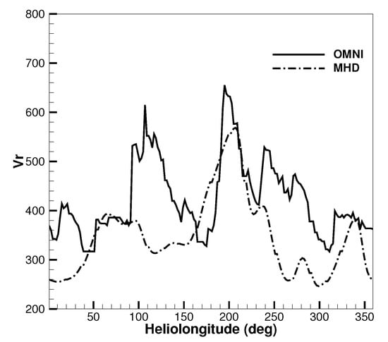 To further validate the simulated results, we map the in situ measurements at 1 au during CR 2207 at the OMNI website back to 20 by using a ballistic approximation [29]. Figure 11 shows the temporal profile of radial speed from the mapped observations (solid line) and the MHD model (dashed line). Although a deviation is exist at the first high-speed stream obtained by the MHD model, the simulated results roughly catch the second and third high-speed streams at about and .