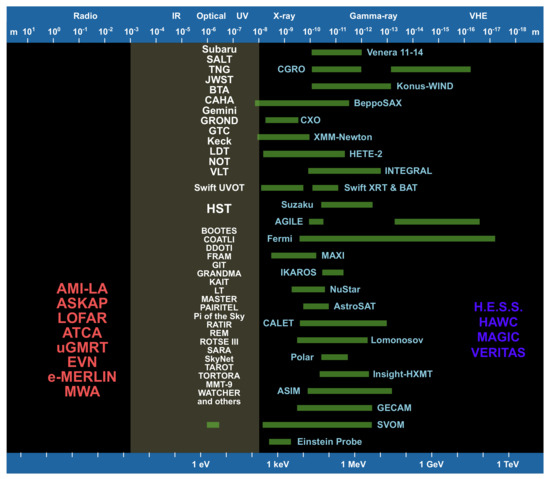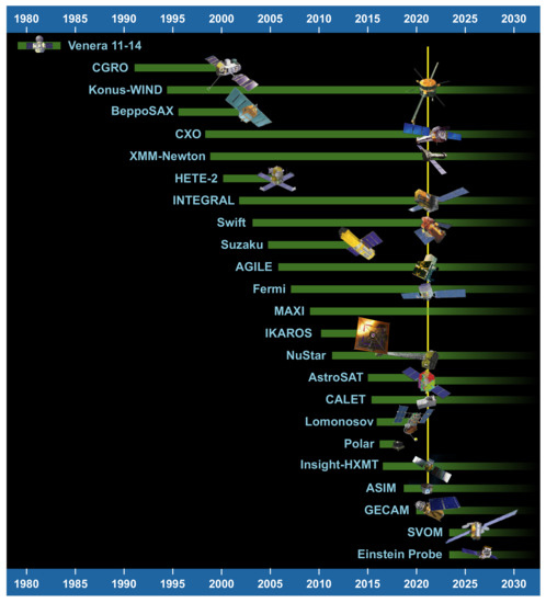 Main past, present, and future space-based missions for GRB science. Based on Figure 1 from [23] with permission from Elsevier.