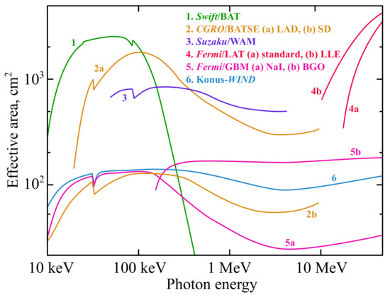 The Astrorivelatore Gamma ad Immagini LEggero (AGILE) is an Italian space mission dedicated to high-energy astrophysics launched in low-Earth orbit on 23 April 2007 [73]. The AGILE payload comprises three instruments able to conduct broad-band (20 keV–50 GeV) observations of Galactic and extragalactic objects: a tungsten-silicon tracker (ST) with imaging capability, operating in the 30 MeV–50 GeV band; a coded mask hard X-ray imager SuperAGILE (SA), acquiring data in the 18–60 keV band; and a CsI(Tl) all-sky MiniCALorimeter (MCAL), working in the 0.4–100 MeV energy range. ST and MCAL together form the Gamma-Ray Imaging Detector (GRID). AGILE has an anti-coincidence (AC) system and plastic scintillation detectors surrounding the main detectors, sensitive to the -rays in the ∼50–200 keV band. Due to a failure of the onboard reaction wheel after two years since the launch, AGILE lost its capability to point at a certain position in the sky. It also started to spin around its Sun-pointing axis, which can affect spectral analysis, as the incident angle varies in time, which requires correction of the DRM for the events lasting more than several tens of seconds or minutes. Only a few very long-lasting GRBs have been detected in the “spinning period” and required a special approach [74].