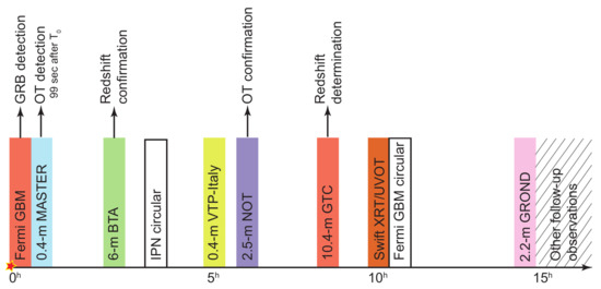 Sample GRB observation timeline. The figure shows the approximate time of observations obtained for GRB 140801A by the different facilities. For IPN and Fermi GBM, the time of GCN circular publication is shown. Adopted from Figure 2 in [25].