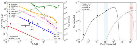 It is believed that the main contribution to the GRB afterglow emission is synchrotron radiation from electrons accelerated in the presence of a magnetic field in the “external” shock produced as the blast wave from the explosion collides with and sweeps up material in the circumburst medium [129,130,131]. The afterglow emission spectrum from X-ray to radio is expected to appear as a sequence of smoothly connected power laws , where the energy spectral index is determined by the index of the electron energy distribution p and the frequency in relation to the evolving breaks in the spectrum (e.g., [132]). These break frequencies are the cooling frequency , the characteristic synchrotron frequency , and the self-absorption frequency .