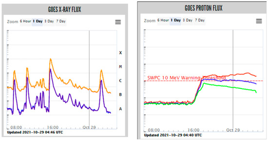 The relevant Alert of >100 MeV protons and flux >1 pfu from GOES was issued in real time by NOAA on 28 October 2021 at 16:51 UT. The increase in the GOES proton flux (Figure 9) triggered an S1-category solar radiation storm, according to NOAA scales. The GLE Alert++ signal by NKUA/A.Ne.Mo.S. was issued 45 min earlier than the one issued by GOES.