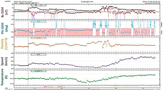 The associated CME with the X1.0 flare finally arrived at the Earth on 31 October at approximately 09:12 UT (vertical grey line). Solar wind and plasma data were provided by DSCOVR spacecraft.