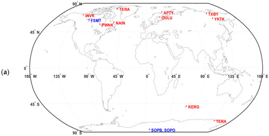 GLE73 was recorded by a total of 13 NM stations around the world (Figure 3a), mostly located in near-polar regions. The characteristics of these NMs are provided in Table 1, which includes the main characteristics of each NM station, such as abbreviation, geomagnetic cutoff rigidity (R), altitude, geographic longitude and latitude, onset time of the GLE73, and finally the percent increase in the cosmic ray intensity registered by each station.