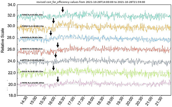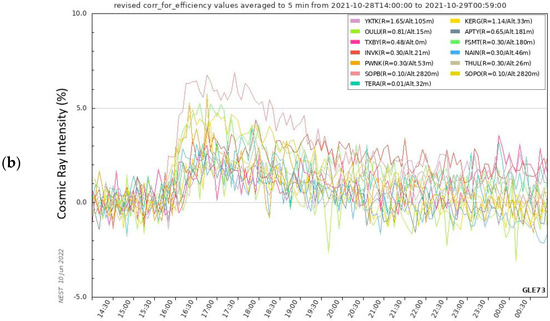 The percentage increase in the recorded cosmic ray intensity for each one of the stations is illustrated in Figure 3b, using the online tool NEST of the high-resolution Neutron Monitor Database (NMDB) (http://www1.nmdb.eu (accessed on 28 October 2021)).