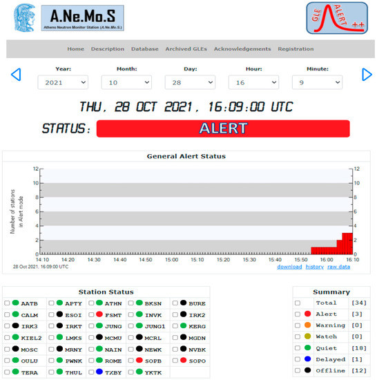 The GLE Alert++ system of the Athens Neutron Monitor Station (A.Ne.Mo.S.) of the Physics Department at the National and Kapodistrian University of Athens (NKUA) produced a real-time Aaert on October 28 at 16:06 UT based on the NM stations Fort Smith (FSMT) Canada, South Pole Bares (SOPB), Antarctica and South Pole (SOPO), and Antarctica, as shown in Figure 4. As shown in this figure, the web interface of the GLE Alert++ gives valuable information. Firstly, it provides access to the description of the service, the archived GLEs, and the registration service, where users may register for an email notification. Moreover, it provides plots that display the evolution of the General Alert. Finally, it presents the NM stations that contribute to the GLE Alert++, including a notification of their data flow in different colors (Quiet for station alert level 0—green color, Watch for station alert level 1—yellow color, Warning for station alert level 2—orange color, Alert for station alert level 3—red color, Delayed for stations that are nearly real time and send usable minutely data in a predetermined time window—blue color, and Offline for stations that do not send at least one measurement in the above time window—black color) [5].