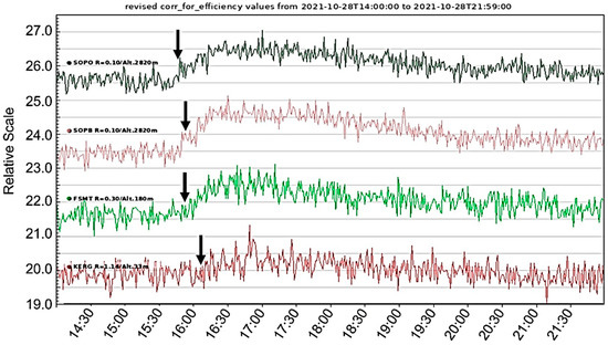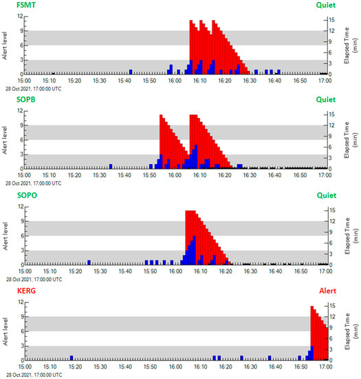 For GLE73, the SOPB NM status at 15:55 UT was on alert mode, followed by SOPO NM at 16:05 UT and by FSMT NM at 16:06 UT. Later, and while the status of these three NMs was again on “Quiet”, the Kerguelen (KERG), France NM was on alert mode at 16:54 UT. All this information is provided in Figure 6. The alert levels are described in the previous paragraph, and the elapsed time is the remaining time from the start of the station recorded the event till the end of the event. Figure 5 shows the cosmic ray intensity variations for the NM stations that detected GLE73 in real time. In Figure 6, the screenshots of the GLE Alert++ system on 28 October 2021 during the GLE73 for the stations SOPB, SOPO, FRTM, and later KERG in Alert mode are presented.