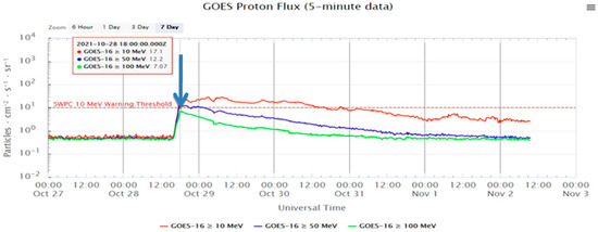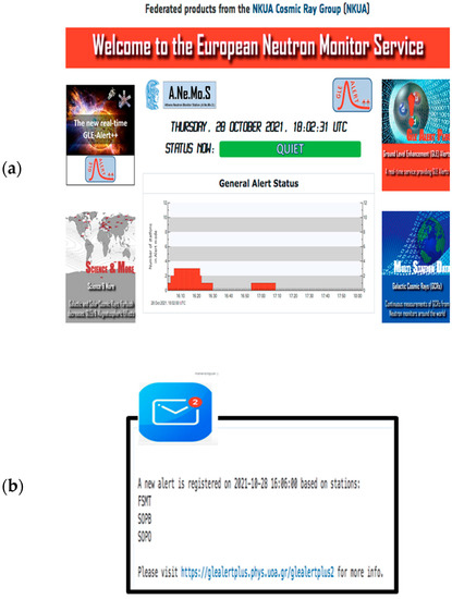 Finally, the GLE Alert Plus application available on the ESA SWE portal (http://swe.ssa.esa.int/web/guest/space-radiation (accessed on 28 October 2021)), as presented in Figure 7a, produced an email notification that was sent to all subscribed users on 28 October 2021 at 16:09 UT (Figure 7b).