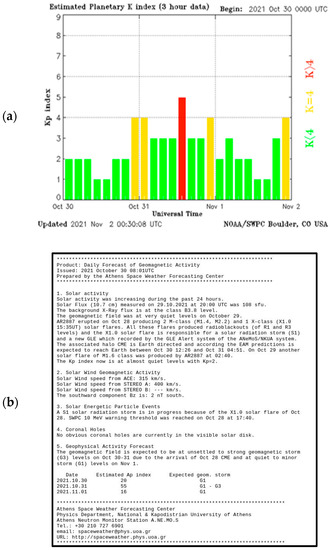 (a) Kp index variations for 30 October 2021–1 November 2021 and (b) the corresponding Daily Space Weather Forecasting Report from A.Ne.Mo.S. for the same time period.