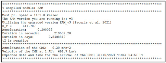 Regarding the Space Weather Reports by the Athens Space Weather Forecasting Center at the A.Ne.Mo.S./NKUA, a minor geomagnetic storm of G1 category was triggered in contrast to the forecasts, where the most probable case was a G3-category storm (Figure 10). One possible explanation is that the major part of the CME traveled below the Sun–Earth line due to the asymmetric shape of the CME. Moreover, the arrival of the CME was successfully forecasted and reported. In particular, the predictions for the time-of-arrival as well as the speed-on-arrival of the CME at 1 AU were performed by utilizing the Effective Acceleration Model (EAM) model [24,25]. According to the output from the last version of the EAMv3 [25] model (Figure 11), the CME should have arrived on 31 October at 04:51 UT with a maximum speed of ~690 km/s. The CME finally arrived just 4 h and 20 min later with a maximum speed of ~470 km/s.