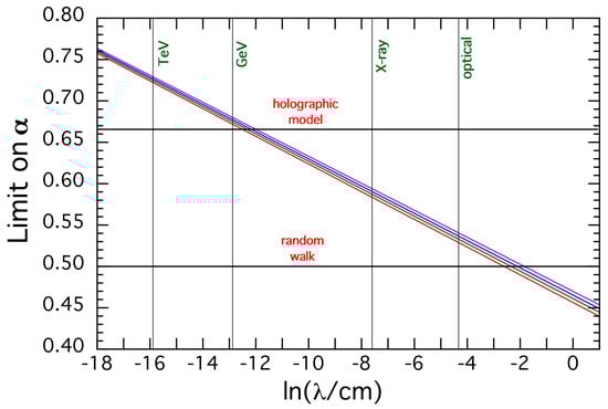 corresponding to the case of of Equation (1). One can also derive [6,7] the above result by appealing to the holographic principle [8,9,10,11], which states that the maximum number of degrees of freedom I that can be put into a region of space is given by the area of the region in Planck units. Accordingly, for a sphere of radius ℓ, the entropy S is bounded by , where is the Boltzmann constant. Recalling that , we get . The average separation between neighboring degrees of freedom then yields , up to a multiplicative factor of order 1. Now it is abundantly clear that the spacetime foam model parameterized by is consistent with the holographic principle in quantum gravity, and hence it is called the holographic foam model.