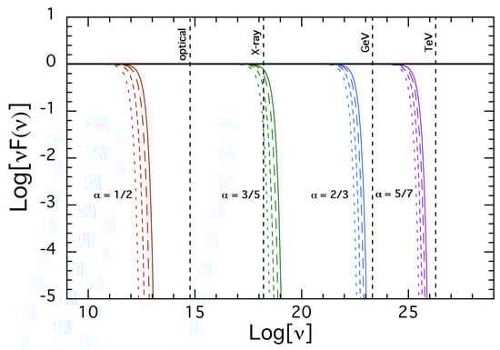 At TeV energies, the highest redshift source is at [36]. This upper envelope is produced by photons in the optical-IR extragalactic background light (EBL, [37]), which interact with very high-energy gamma-rays to produce electron–positron pairs. These photons can then cascade to produce lower-energy photons. A detailed study of the EBL [38] shows that the optical depth due to pair production becomes non-negligible () at around 50–100 GeV for sources at and at around 300 GeV for sources at . However, because the effect we address here regards the mere formation of an image, the appropriate threshold is . Optical depth is reached at 1 TeV for sources at (red line in Figure 1, solid curves in Figure 2) and 100–200 GeV for sources at (see [38], their Figure 7). For , the majority of the photons observed can be secondaries from the resulting cascades (which originate a tiny distance from the pair-production event, [39]), rather than primaries from the source itself. As a result, it is possible for a source, if detected, to form an image at distances much larger than Mpc. We note that while the cascading photons can form a halo to the image of the source at TeV photon energies due to the influence of the intergalactic magnetic field (IGMF, see [40], particularly their Figure 6, which simulates the image of a BL Lac object for a choice of IGMF), that is secondary to whether an image is formed at all.