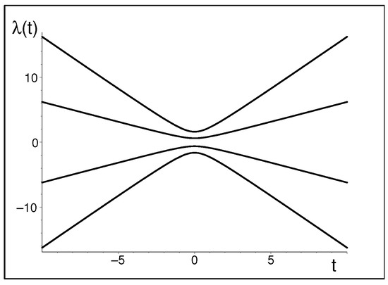 and by the inspection of its spectrum (see Figure 1). As long as the matrix is Hermitian, its spectrum must be real. Moreover, in the generic case (i.e., unless we impose a symmetry upon the matrix), the spectrum must remain non-degenerate. This is the reason that the levels avoid the crossing (which would simulate the regularized Big Bounce). In our example, the proof of the phenomenon is elementary: up to a small vicinity of the “Big Bang time” , the matrix as well as its spectrum are dominated by their asymptotic components, which are strictly linear in t. One might even suspect that the eigenvalues could cross due to an accidental symmetry emerging at , but such a symmetry is manifestly broken by the t-independent component of the model.