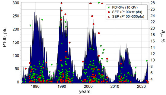 Along with SEP events, Forbush effects or Forbush decreases (FD)—changes in the density and anisotropy of cosmic rays (CR) [21,22,23,24,25]—also often represent the consequences of sporadic processes on the Sun; they are observed after the ejections of solar matter usually associated with solar flares. Despite the fact that SEPs are events in solar CRs, and FDs are events in galactic CRs, both phenomena are often associated with the same (usually) fast CME. Therefore, it is reasonable to assume that between the characteristics of these events there may exist, if not physical, at least statistical relationships. There are many works that establish statistical relationships between FD and CME characteristics (see, for example, Richardson and Cane [26], Belov et al. [27], Masías-Meza et al. [28], Papaioannou et al. [29], Abunina et al. [30], Melkumyan et al. [31]). In Belov et al. [32], the authors showed that in solar cycle 23, the CMEs that led to ground level enhancements (GLEs) of the solar CR flux with a high degree of probability also created large FDs (with amplitude () > 7%) in the Earth’s orbit, and induced very large geomagnetic storms. Henceforth, the amplitude of FDs () is calculated by the Global Survey Method (GSM, Belov et al. [33]) using the data of the worldwide network of neutron monitors for particles with a rigidity of 10 GV. This was especially pronounced for events with a solar source located in the central longitudinal range. Figure 1 shows the distribution in time and magnitude of FDs with 3% (right y-axis scale) and proton events with a maximum flux > 1 and >300 pfu (i.e., particle flux unit = 1 particle/cm sr s) for particles with energies E > 100 MeV (left y-axis scale) against the background of the sunspot number. Note that the magnitude of six large proton enhancements (29 September 1989, 19 October 1989, 22 October 1989, 14 July 2000, 8 November 2000, and 20 January 2005 with maximum fluxes of 559, 400, 380, 623, 451, and 650 pfu, respectively) are not shown in the figure (marked with red triangles). It can be seen from the figure that most often both large FDs and large SEPs occur at the maximum of solar activity, as anticipated.