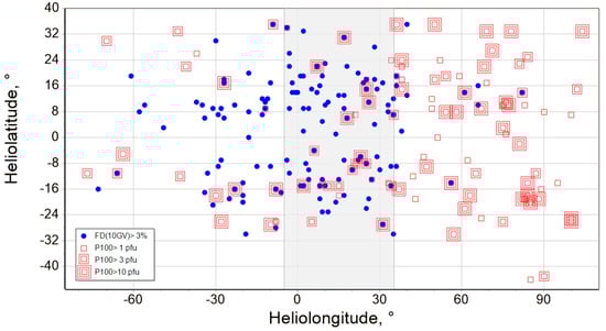 We consider the distribution of longitudes of solar sources associated with FDs (with 3%) and SEPs with different maximum fluxes (Figure 2). It is obvious that the sources of FDs are mainly located in the central zone (30 E–30 W), (see also Papaioannou et al. [29]), while the sources of SEPs are shifted to the west (20 W–80 W), which is consistent with the conclusions of earlier works (e.g., Belov et al. [32]). This difference is explained by the structure of the interplanetary solar wind between the Sun and the Earth close to the Parker Spiral. Therefore, we decided to limit our study to a central range of longitudes: 04 E–35 W, which is located at the intersection of the two above-mentioned zones (this central range is marked in Figure 2 by the gray shaded area).