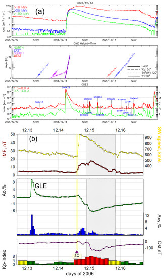 An example of an event from the GLE group: (a) PHTX (taken from SOHO/LASCO CME Catalog); (b) behavior of the main SW, IMF, CR, and GA parameters during the FD on 14–15 December 2006.