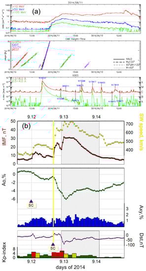 Figure 4 shows the main parameters of the events on 10 and 12–14 September 2014 from the group. It was associated with an X1.6 class solar flare that occurred on 10 September 2014 at 17:21 UT in AR12158 (N14E02). In the coronagraph data at 18:00 UT, a Halo CME was registered with an initial speed of 1267 km/s. It led to an increase in solar proton fluxes to levels of 30 and 0.8 pfu at and , respectively. On 12 September 2014 at 15:53 UT, an interplanetary disturbance associated with the aforementioned flare and CME was detected on Earth with the following SW, IMF, and CR parameters, respectively: = 730 km/s, = 31.7 nT, = 5.9%, and = 2.09%. The MC passed by the Earth from 22:00 UT on 12 September to 02:00 UT on 14 September. During this event, a moderate geomagnetic storm ( = 6+, = −88 nT) was registered.