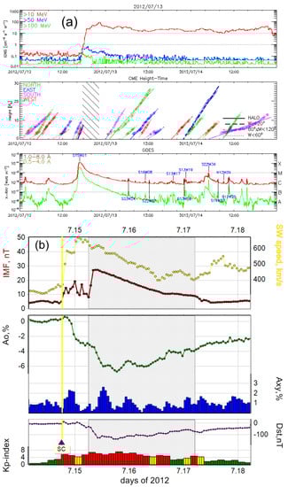 Figure 5 shows an example of an event from the group. On 12 July 2012 at 15:37 UT, an X1.4 flare was detected in AR11522 (N13W15), followed by a Halo CME (at 16:48 UT, with an initial speed of 885 km/s). The proton fluxes reached = 90 pfu and = 0.2 pfu. The corresponding ICME reached the Earth’s orbit on 14 July 2012 (shock arrival at 18:09 UT). The maximum recorded SW velocity was = 667 km/s, the maximum value of the IMF modulus = 27.3 nT, the FD amplitude = 7.6%, and the maximum value of the equatorial component of CR anisotropy = 2.62%. An MC was also registered in this event (beginning at 06:00 UT on 15 July, with duration of 47 h). A strong geomagnetic storm was registered ( = 7, = −139 nT).
