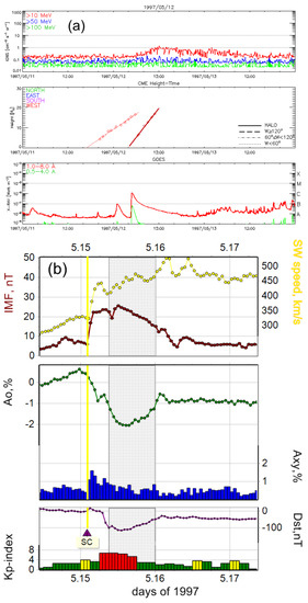 Figure 6 shows an example of an event from the Weak group. It is associated with a small C1.3 flare that occurred on 12 May 1997 at 04:42 UT in AR8038 (N21W08). A rather slow Halo CME with an initial velocity of 464 km/s was registered in the coronagraph data at 05:30 UT; it led to a slight increase in solar proton fluxes to levels of 0.9 and 0.02 pfu for and , respectively. On 15 May 1997 at 01:59 UT, an interplanetary disturbance associated with this flare and CME was registered on Earth with the following SW, IMF, and CR parameters, respectively: = 527 km/s, = 25.6 nT, = 2.7%, and = 1.6%. The MC passed the Earth on 15 May from 09:00 UT for 15 h. During this event there was a strong geomagnetic storm ( = 7−, = −115 nT).