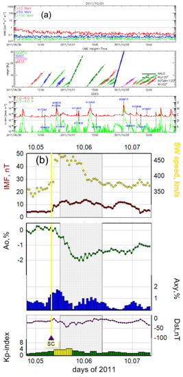 An example of an event from the Control group: (a) PHTX (taken from SOHO/LASCO CME Catalog); (b) behavior of the main SW, IMF, CR, and GA parameters during the FD on 5–7 October 2011.
