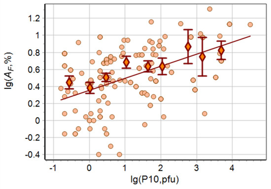Next, we consider the relationship between the FD amplitude () and the peak proton flux for particles with energy E > 10 MeV () (Figure 8). There is a connection ( = 0.45 ± 0.08) explained by the natural properties of solar sources: mainly this connection is due to both an SEP and an FD being dependent on the speed of the corresponding CME. It is the high that is the key parameter for the increases in particle acceleration, CR modulation, and geomagnetic activity. We further stress that if sufficient statistics are collected for the longitudinal range under study, the correlation will significantly improve.