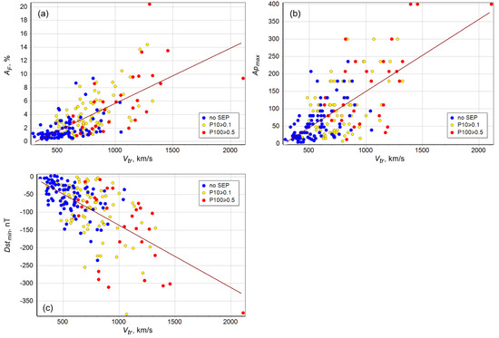 Figure 9a–c show the dependencies of the FD amplitude (), , and -indices of geomagnetic activity on the transit speed of the corresponding ICME () (see definition in Belov et al. [51]) for all the events under study. In the figures, the values of the peak proton flux in SEP events are additionally marked with colors: yellow—FDs associated with flares after which the peak proton fluxes (≥0.1 pfu) for particles with energies E > 10 MeV were recorded; red—FDs associated with flares after which the peak proton fluxes (≥0.5 pfu) for particles with energy E > 100 MeV were recorded; and blue—FDs associated with flares after which no increase in the proton flux was registered. It can be seen that all the listed parameters have a close relationship with the transit speed: = 0.7 ± 0.05, = 0.68 ± 0.05, and = −0.63 ± 0.05. We also note that, in general, the greater the registered proton flux enhancement and the ICME transit velocity, the greater the values of the studied parameters in this work. For example, for a transit speed of <500 km/s, the corresponding FDs are less than 3%, while the maximum -index (i.e., >40) and the minimum -index (<−50 nT) are registered only in every fifth case. It can also be seen that in events without SEPs, a transit velocity of >1000 km/s was recorded only in 2 cases out of 91, and with 0.5 in 15 cases out of 29.