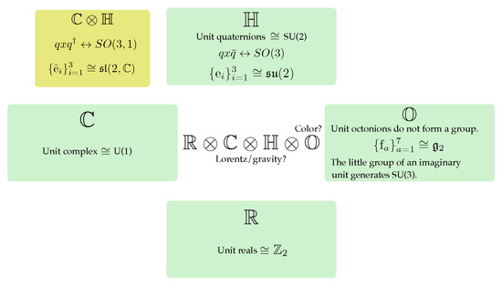 Thus, it seems we have to content ourselves with the reals, the complex, the quaternions and the octonions as our possible numbers. This is supported by Hurwitz’s theorem that states that the only normed division algebras are indeed , , and . This is a very remarkable result and, thus, it is very tempting to find their appropriate place to describe physics. Delving into their respective group structures, we have seen that the real unit quaternions are nicely related to , which is a result that resembles the relation of unit complex numbers to , while complex quaternions naturally give representations of the Lorentz group. On the other hand, octonions are related to , which contains as a subgroup. Thus, we conclude that the only four normed division algebras are intimately related to the fundamental groups of the standard model (possibly even including gravity). It is then extremely appealing to employ4 as the algebraic framework to formulate the fundamental laws of physics (see Figure 1). Exploring these speculations has led to remarkable insights, and it is an increasingly viable hypothesis that the elementary forces and particles are numbers (see e.g., [9,10,11]).