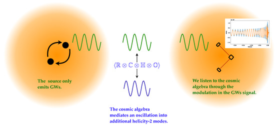This figure illustrates the considered scenario leading to the oscillation of GWs. Initially, a pure GWs signal is generated by the source. The cosmic medium with a non-trivial background of induces an oscillation between GWs. Our interferometers will only be sensitive to the GWs signal, but the oscillations are imprinted so we can indirectly hear the sounds of the algebras.