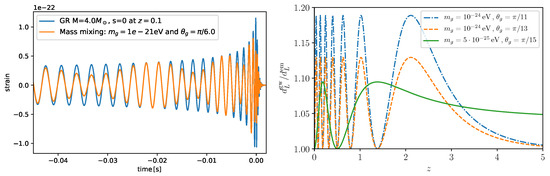 From [16]. The left panel shows a clear signature of the mixing of GWs with an additional helicity-2 mode mediated by a non-trivial background due to . The right panel shows a possible signature in the luminosity distance. The plots correspond to different masses and angle mixing.