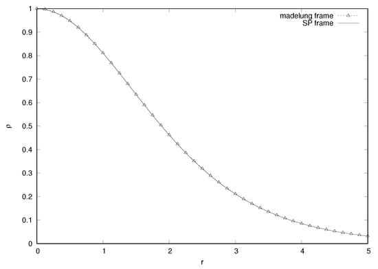 Densities and of the ground state equilibrium solution in the SP and the Madelung frames, respectively. In the SP frame, Equations (10) and (11) are solved for the central wave function . In the Madelung frame Equations (14)–(18), we use the central density . The numerical solution is constructed on a discrete domain with resolution .