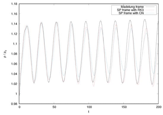 Central density for the solution in the SP frame and in the Madelung frame, as functions of time. This plot shows that the first oscillation mode is similar, although not perfectly equal in the two frames. In the SP frame, the period coincides with that in [16], whereas the period in the Madelung frame shrinks in time.