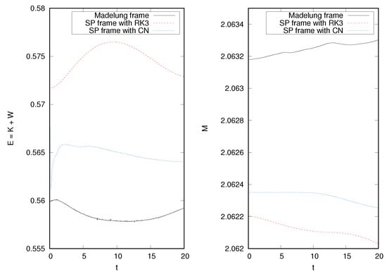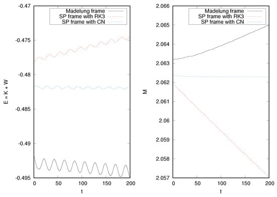 In Figure 3, we show the evolution of the mass M and total energy as functions of time. We can see that in the Madelung frame, the mass is slightly bigger than in the SP frame, which is due to the contribution of the atmosphere. Since this atmosphere is of the order of , it contributes with a mass of order . On the other hand, the mass in the SP frame decreases when using the MoL, which is due to the dissipation of the time integration with the explicit RK3 method, whereas the conservation is better when using the CN method, indicating the evolution is closer to unitary.