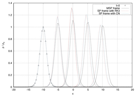 Snapshots of the density are shown in Figure 4. Notice that the maximum of the configuration using the hydrodynamical method in the Madelung frame locates at the appropriate position, since the velocity field is one. On the other hand, the configurations evolved in the SP frame retard with respect to the appropriate location of the maximum density. Nevertheless, this is due to the implementation of the momentum, which actually is a phase, and not a true velocity field at initial time.