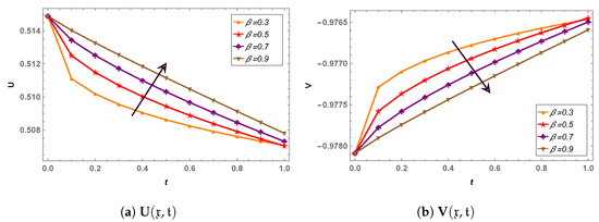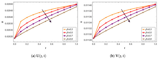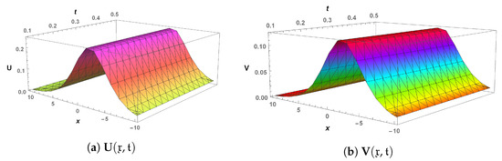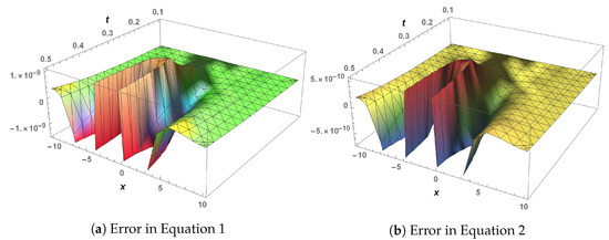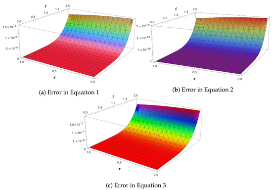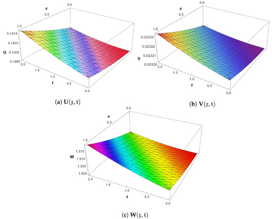 In the next phase of analysis, a time-fractional generalized Hirota–Satsuma coupled KdV system is computed through LHPM, and a comparison of LHPM and RDTM at = 1 has been made for validity purposes in Table 5. The obtained results clearly indicate that LHPM is better than RDTM. For convergence of the proposed scheme, the system is solved for different values of the fractional parameter, and solutions along with residual errors are mentioned in Table 6. For graphical analysis, 3D plots of the LHPM solution (see Figure 7) and their error (see Figure 8) are presented to check the behavior of solution components. It is observed that the fractional parameter has an indirect relation with all the solution components (see Figure 9). In addition, , and increase with the increase in time.