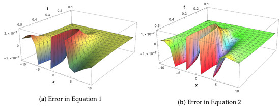 Next, we apply LHPM to a nonlinear time-fractional coupled dispersive long-wave KdV system in Example 2, and the numerical results are shown in Table 3 and Table 4. Table 3 presents the comparison of LHPM and LADM at = 1. Analysis of this table showed the dominance of LHPM over the LADM. For the convergence confirmation of the proposed method over the entire fractional domain , Table 4 displays the solutions along with residual errors at different values of . This table indicates that the proposed method is consistent throughout the fractional domain. A graphical analysis of Example 2 is depicted in Figure 4 and Figure 5. These figures show the LHPM solution and error, respectively. The effect of the fractional parameter on the solution components can be seen in Figure 6. It is seen that has a direct relation with solution component , while it has an indirect relationship with . It is also noted that decreases while increases with time.